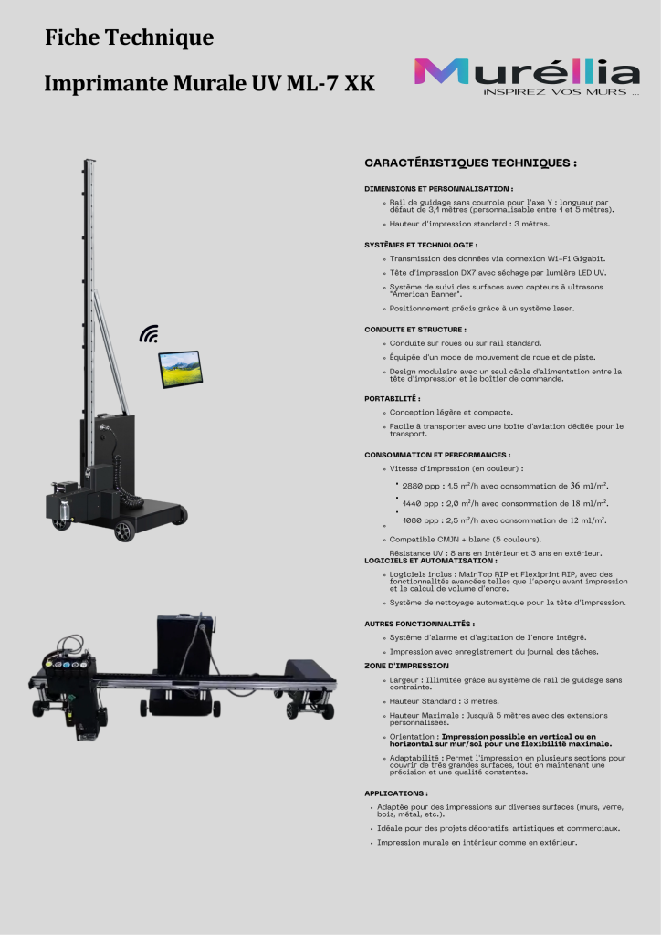 Grâce à la technologie innovante de l’imprimante murale, nous donnons vie à vos murs avec des impressions haute définition, durables et sans odeur. Que vous soyez une entreprise, un particulier, un établissement public, une association sportive ou un organisateur d’événement, personnalisez vos espaces avec une fresque unique, interchangeable et qui vous ressemble.